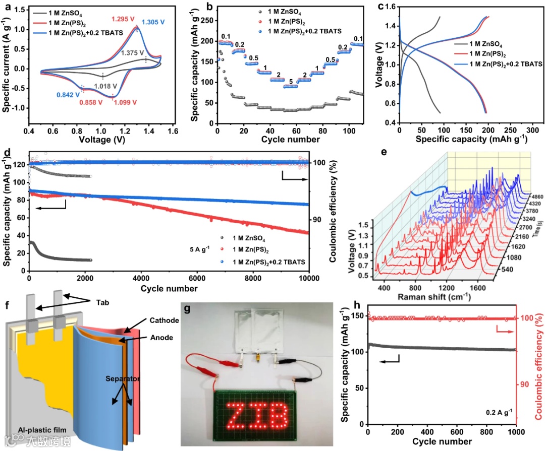 图4. (a)PANI-Zn电池CV曲线。(b)倍率性能。(c)电压-容量曲线。(d)长循环稳定性。(e)PANI-Zn电池在1 M Zn(PS)2+0.2 TBATS电解液原位拉曼测试。(f)软包电池示意图。(g)两节串联软包电池点亮40个LED灯。(h)软包电池循环稳定性。