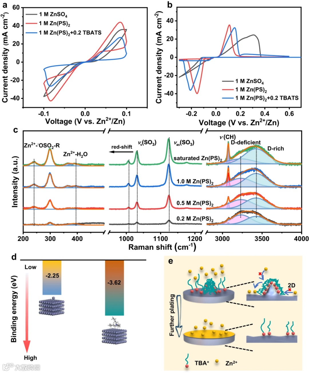 图2. (a)Zn对称电池和(b)Ti-Zn非对称电池CV曲线。(c)Zn(PS)2电解液拉曼光谱。(d)Zn2+和TBA+在锌(002)晶面的吸附能。(e)TBATS添加剂屏蔽效应示意图。