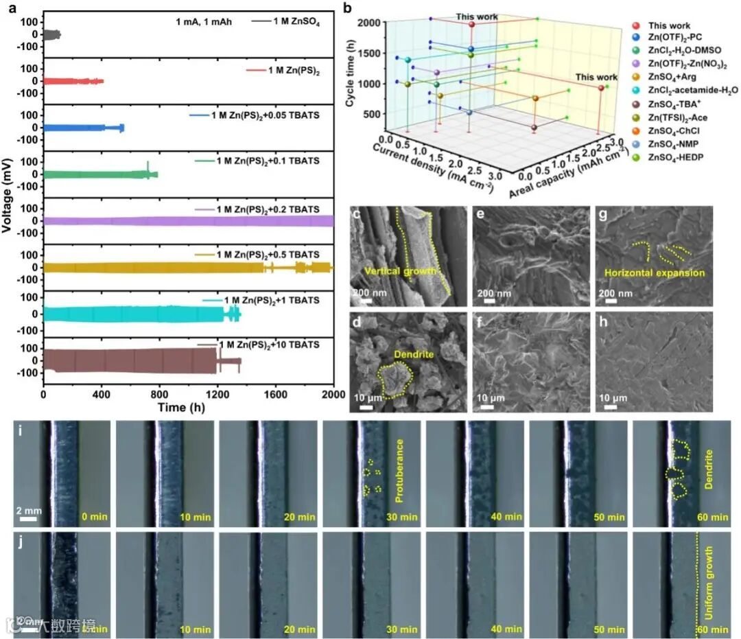 图1. (a)锌对称电池电压-时间曲线。(b)锌对称电池性能对比。锌负极在(c, d)1 M ZnSO4, (e, f) 1 M Zn(PS)2和 (g, h) 1 M Zn(PS)2+0.2 TBATS循环后的SEM图。锌在(i)1 M ZnSO4和(j)1 M Zn(PS)2+0.2 TBATS沉积的的原位光学显微镜照片。