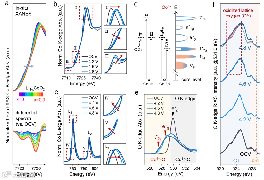 图3.(a—b)原位及非原位 Co K-edge XAS;(c)非原位Co L-edge XAS;(d)Co4+的电子环境和XAS过程;(e—f)O K-edge XAS和RIXS。