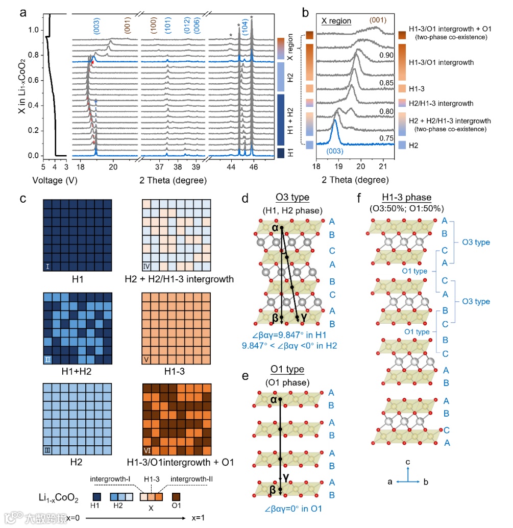 图1.(a,b)钴酸锂原位XRD谱图;(c)钴酸锂相变演化过程;(d—f)O3,O1和H1-3的结构。