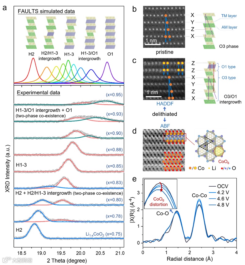 图2.(a)FAULTS拟合与XRD实验结果比较;(b—d)原始和充电态钴酸锂STEM结果;(e)Co K-edge EXAFS数据。