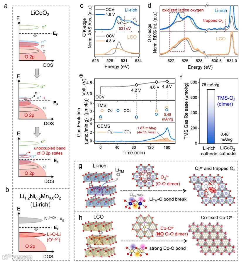 图4.钴酸锂和富锂的(a—b定性的态密度图;(c—d)O K-edge XAS和RIXS结果比较;(e—f)TMS和OEMS结果;(g—h)阴离子氧化还原机制示意图。