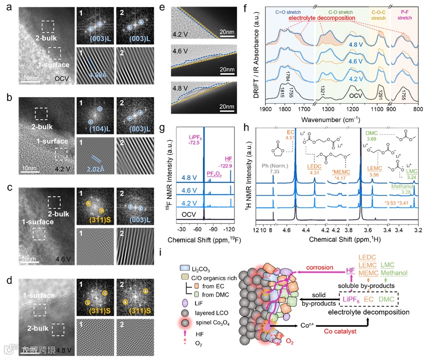 图5.(a—d)HR-TEM所示不同电压钴酸锂表面;(e)不同电压下生成的CEI膜;(f)DRIFT结果;(g—h)19F和1H NMR;(i)界面恶化示意图。