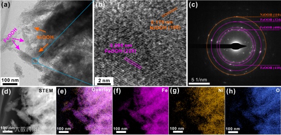图5. Fe(III)催化下原位形成的Fe-NiOOH/Ni-FeOOH异质界面结构表征