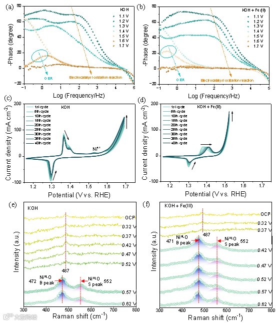 为了研究Fe(III)催化OER活性的机制,进行了原位电化学阻抗、慢速CV扫描和原位电化学拉曼测试。结果表明经Fe(III)催化后,Ni(OH)2电极具有更低的电荷转移电阻和更快的OER反应动力学。同时,加速了Ni2+到Ni4+的转化,即Ni(OH)2更容易转化为γ-NiOOH,使得具有更高OER活性。