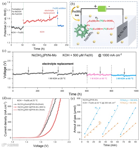 将含Fe-NiOOH/Ni-FeOOH异质界面的Ni(OH)2电极置于KOH中测试时,其活性发生明显衰减,而加入Fe(III)之后活性立即恢复到一开始含Fe(III)溶液中的水平,进一步证实了Fe(III)在反应中是作为动态的催化活性位点,通过Fe3+ → (Ni)Fex+ → (Ni)Fe-OH → (Ni)Fe-O → (Ni)Fe-OOH → Fe3+的反应中间体循环释放O2。基于此,将Ni(OH)2作为阳极,报道的Pt/Ni-Mo催化剂作为阴极组成全解水体系,在Fe(III)催化下,该全解水体系能在不同的KOH浓度(1和 3 M)和温度(25和60 ℃)溶液体系中,工业级电流密度下(1000 mA cm-2)稳定运行1000 h,且HER和OER的法拉第效率都接近100%。