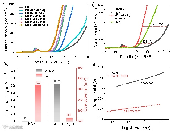 图2. Fe(III)增强Ni(OH)2电极的OER活性