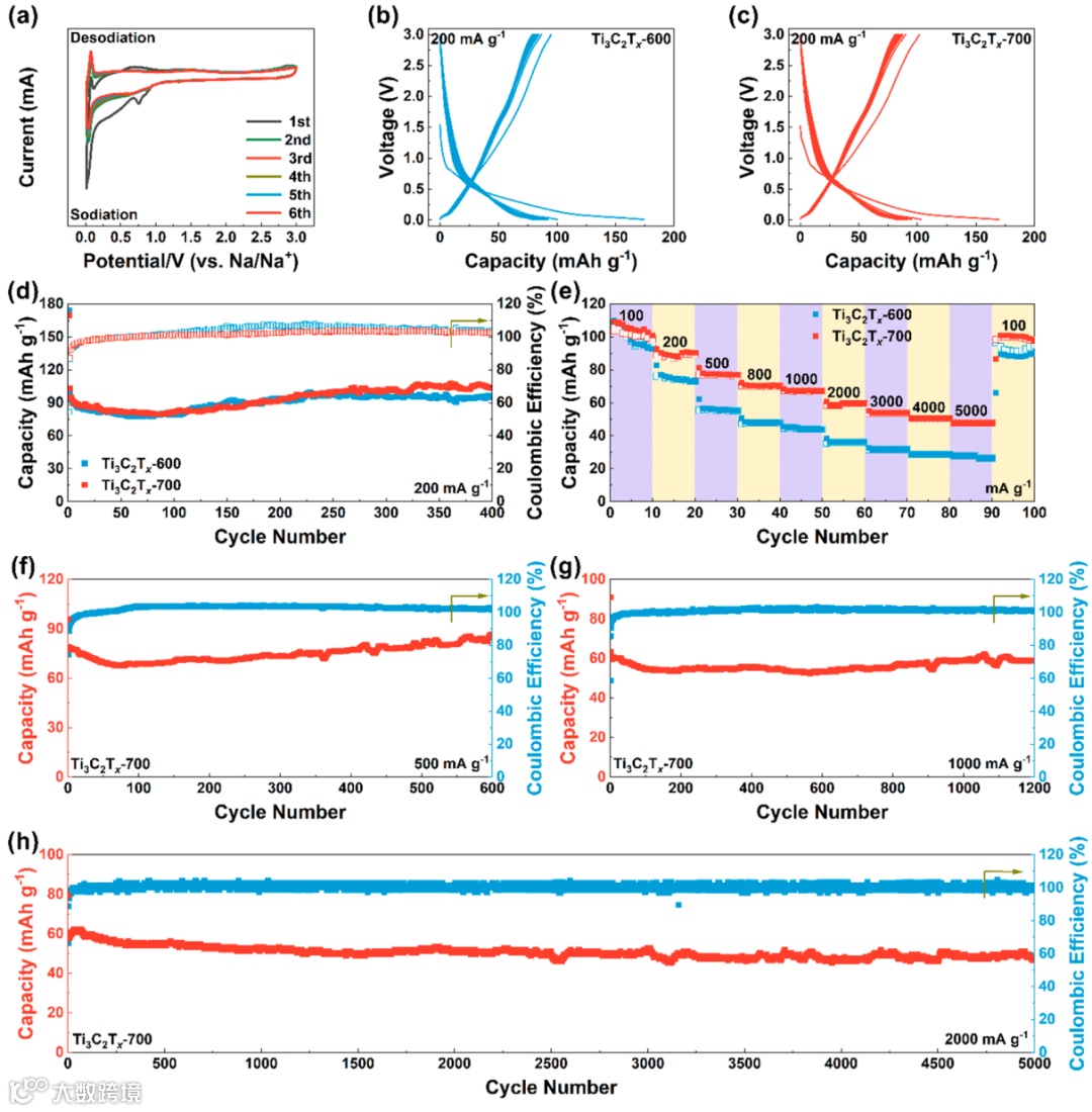 图4. Ti3C2Tx MXene用于钠离子电池负极材料时的电化学性能。(a) Ti3C2Tx-700负极的循环伏安曲线。(b, c)恒流充放电曲线和(d)循环稳定性,电流密度是200 mA g-1。(e)倍率性能图。(f - h)在(f) 500 mA g-1, (g) 1000 mA g- 1和(h) 2000 mA g-1下的循环稳定性。