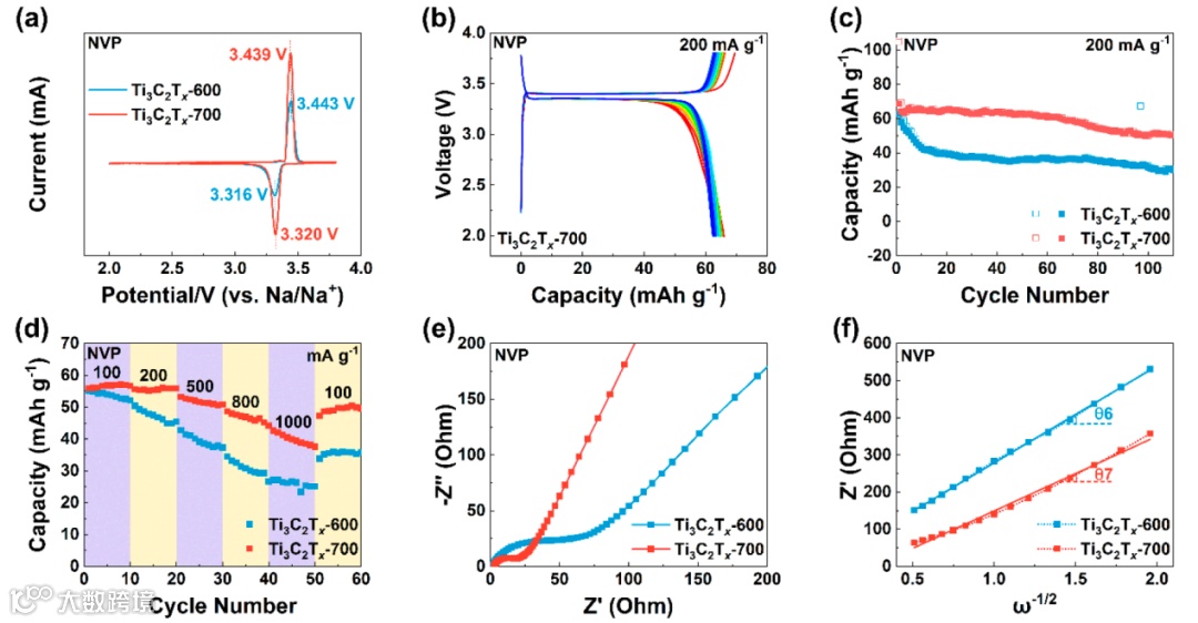 图7. 全电池性能图,正极是NVP,负极是Ti3C2Tx MXene。(a)循环伏安曲线。(b)充放电曲线。(c)循环性能。(d)倍率性能。(e)阻抗图。(f) ω−1/2 vs. Im(ZW)图。