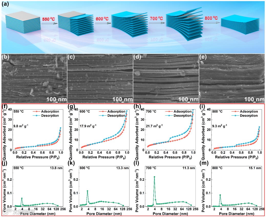 图2. 不同温度下合成Ti3C2Tx MXene的结构演变。(a) Ti3C2Tx MXene的结构演化示意图。在(b, f, j) 550°C,(c, g, k) 600°C,(d, h, l) 700°C,(e, i, m) 800°C下获得的产物的(b-e)SEM图,(f-i) N2吸附-脱吸附等温线和(j-m)孔径分布。