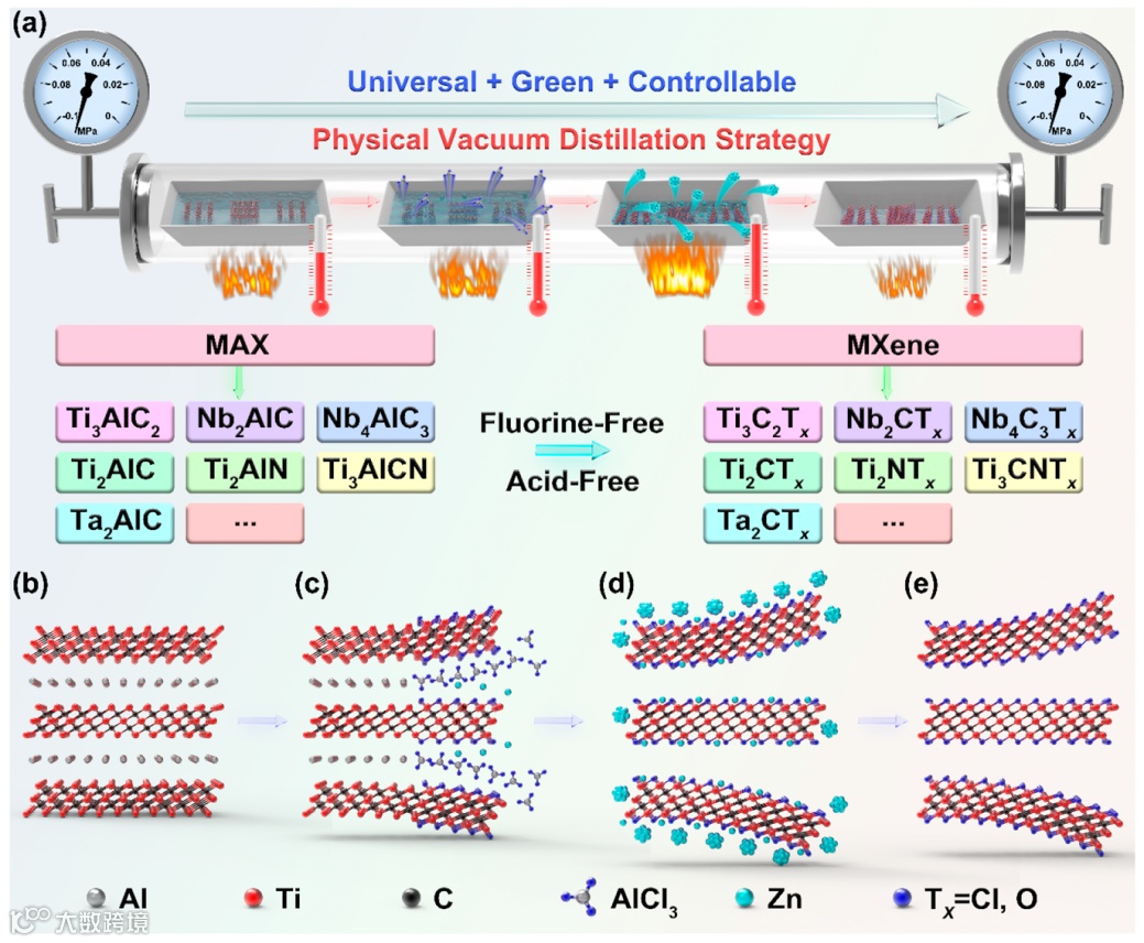 图1. MXene的制备原理图。(a)熔融盐辅助物理真空蒸馏法合成MXene的示意图,(b) Ti3AlC2 MAX相的示意图;(c, d) Ti3AlC2 MAX与ZnCl2的反应过程及Zn的蒸发过程;(e) Ti3C2Tx MXene的示意图。