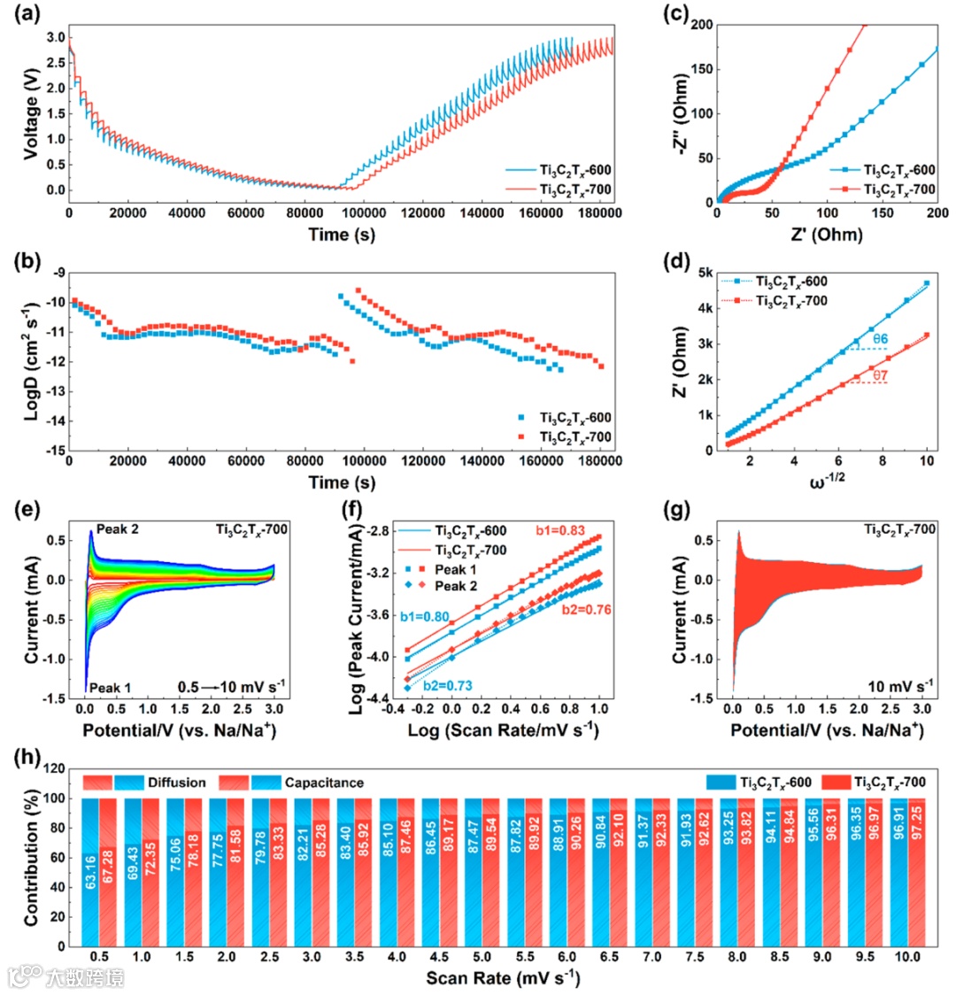 图5. Ti3C2Tx MXene的储钠机理。(a) GITT曲线和(b)扩散系数。(c)阻抗图和(d)ω−1/2 vs. Im(ZW)图。(e)不同扫速下的循环伏安曲线。(f)b值。(g)10 mVs-1下的赝电容贡献图。(h)不同扫速下的扩散和赝电容的贡献比例图。