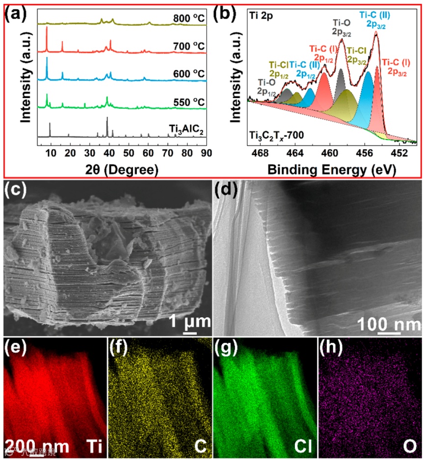 图3. Ti3C2Tx MXene的结构和形貌测试。(a)不同温度下合成的Ti3C2Tx MXene的XRD,(b)Ti3C2Tx MXene-700的Ti 2p图,(c)Ti3C2Tx MXene-600的SEM图,(d)Ti3C2Tx MXene-700的TEM图,(e-h)Ti3C2Tx MXene-700的STEM-EDS图。