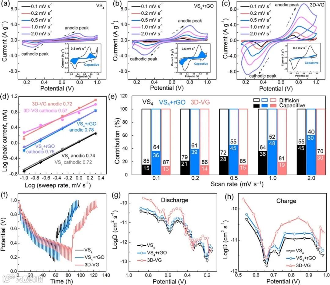 图5 3D-VG电极与VS4和VS4 + rGO电极的电化学行为动力学分析:(a) VS4、(b) VS4 + rGO和(c) 3D-VG在0.1 ~ 2 mV/s的CV曲线以及各样品在0.5 mV/s时电容(蓝色区域)和扩散贡献(空白区域)引起的电流分离;(d)由峰值电流与CV扫描速率的关系得到的b值;(e)不同扫描速率下电容和扩散的总容量贡献率;(f)GITT曲线;(g, h)分别为三种样品在首次放电和充电过程中的Zn2+扩散系数。