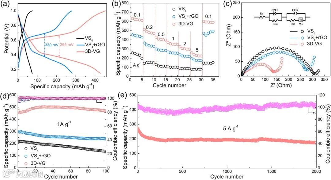 图4 3D-VG、VS4和VS4 + rGO电极的电化学性能比较:(a) 1 A /g时的充放电曲线;(b) 0.1、0.2、0.5、1、2和5 A/g时的倍率性能;(c) Nyquist曲线 ;(d) 1 A/g时的循环稳定性;(e) 3D-VG电极在5 A/g下的长寿命循环性能。