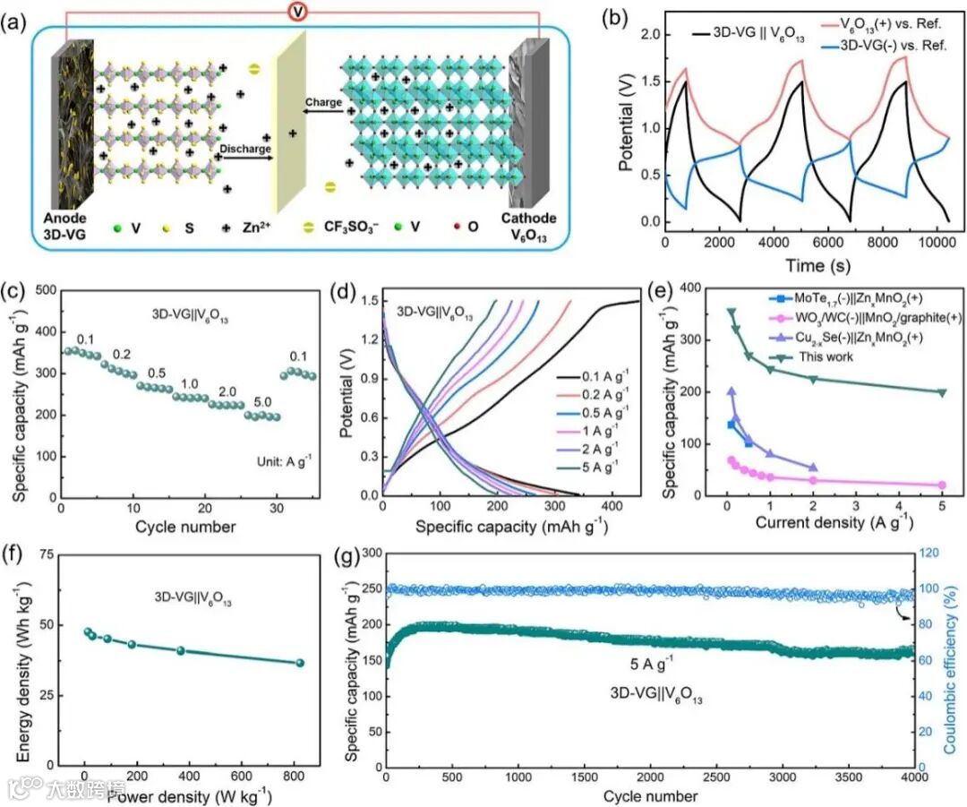 图6 3D-VG||V6O13 ZIB器件的电化学性能。(a)可充电3D-VG||V6O13 ZIB原理示意图;(b) 3D-VG|| V6O13 ZIB在0.5 A/g下的前三个周期GCD曲线;(c) 0.1、0.2、0.5、1、2、5 A/g电流密度下3D-VG||V6O13 ZIB器件的速率性能;(d)不同电流密度(0.1 ~ 5 A/g)下对应的GCD曲线;(e) MoTe1.7(-)||ZnxMnO2(+)、WO3/WC(-)||MnO2/石墨(+)、Cu2-xSe(-)||ZnxMnO2(+)和本工作的3D-VG(-)||V6O13(+)等几种无锌金属负极ZIBs在不同电流密度下的比容量比较;(f) 3D-VG|| V6O13 ZIB的Ragone图;(g) 3D-VG||V6O13 ZIB在5 A/g下的长期循环性能。