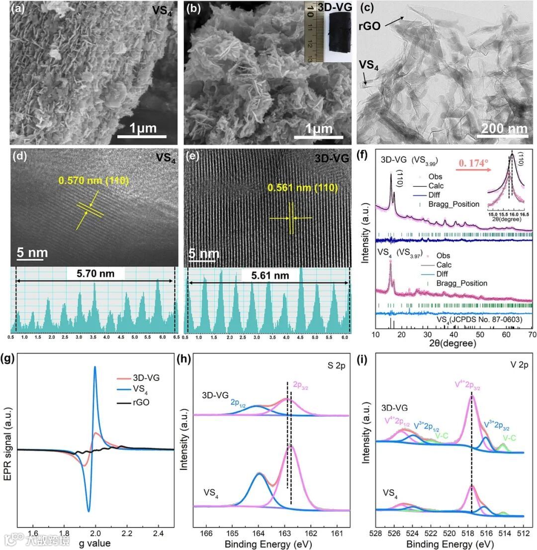 图3 (a) VS4和(b) 3D-VG的SEM图;(c) 3D-VG的TEM图像;(d) VS4和(e) 3D-VG的高分辨率TEM图;(f) VS4和3D-VG的精修XRD谱图(放大的(110)峰见右上);(g) VS4和3D-VG的EPR谱;VS4和3D-VG的(h) S 2p和 (i) V 2p XPS光谱。