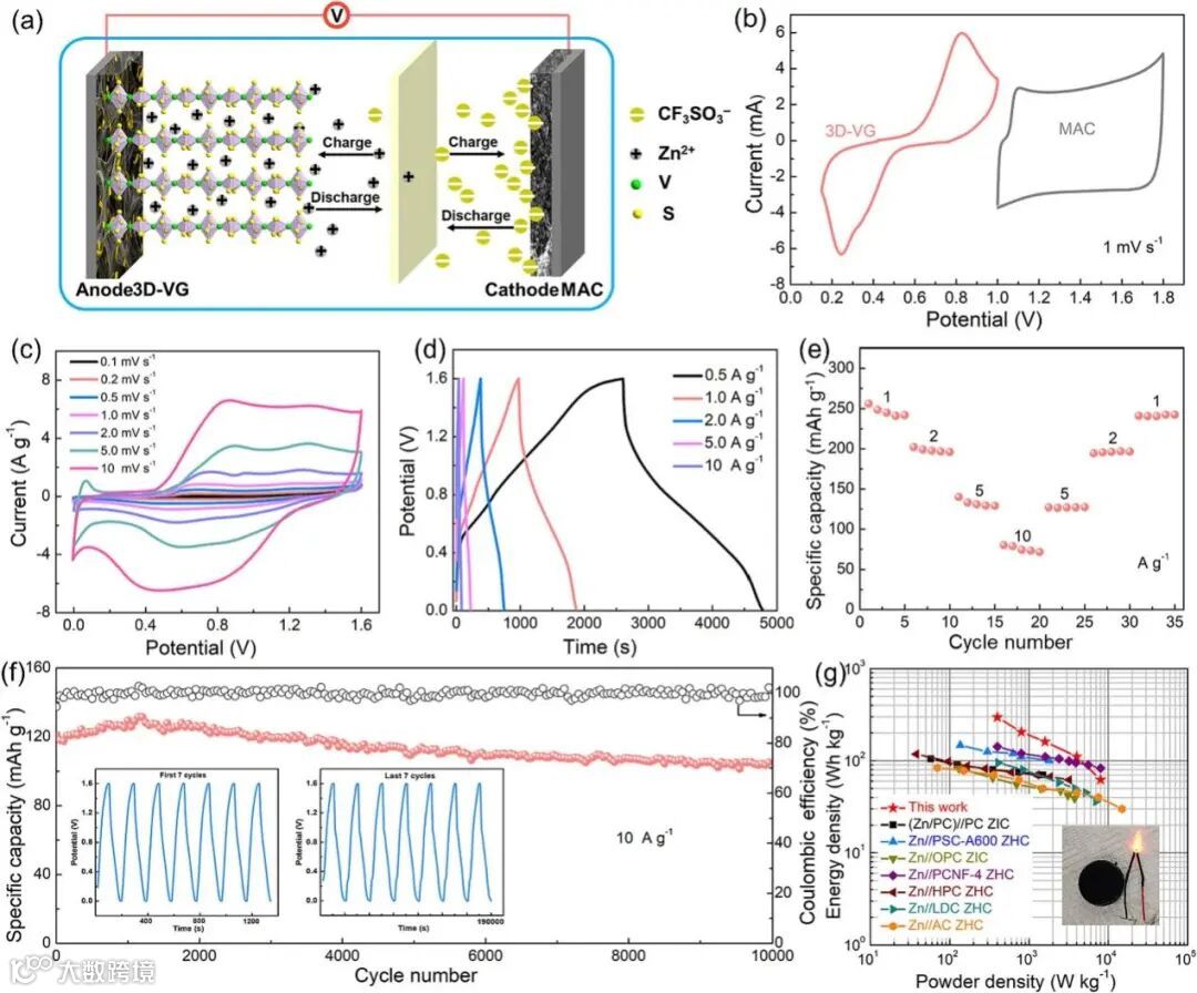 图7 3D-VG||MAC ZHC装置的电化学性能。(a)可充电3D-VG||MAC ZHC原理示意图;(b)扫速为1mV/s时3D-VG和MAC电极的CV曲线;(c)不同扫速(0.1 ~ 10 mV/s)下3D-VG||MAC ZHC器件的CV曲线;(d)不同电流密度(0.5 ~ 10 A/g)下的充放电曲线;(e)不同电流密度(0.5 ~ 10 A/g)下的倍率性能;(f) 10 A/g时的循环稳定性;(g) 3D-VG||MAC ZHC与其他混合型锌离子电池的Ragone对比图,以及由两个3D-VG||MAC ZHC串联供电点亮红色LED灯 (内嵌图)。