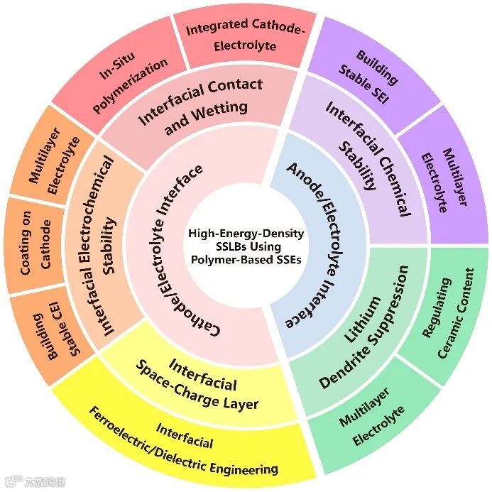 下图总结了锂电池电极/聚合物基固态电解质的界面问题及修饰改善方法。
