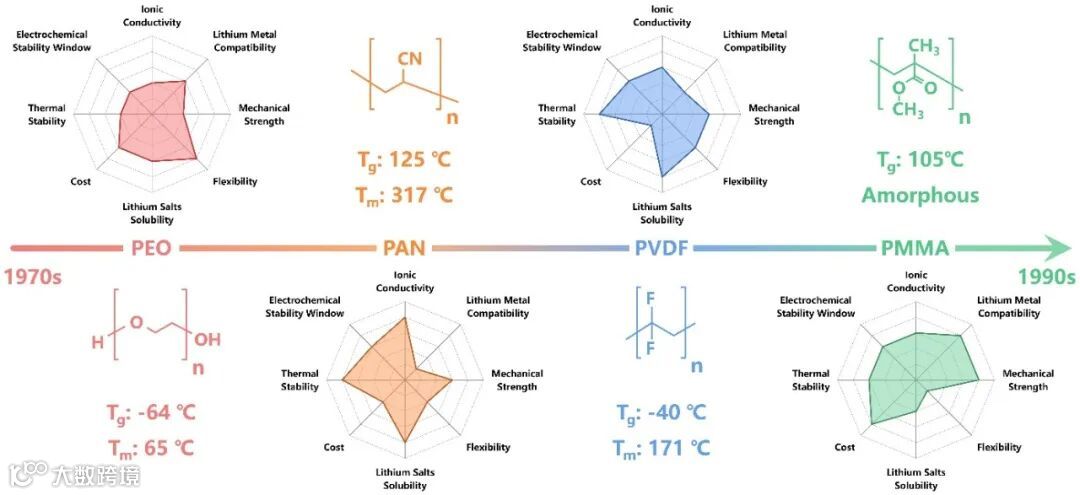 经过数十年的发展,聚环氧乙烷(PEO)、聚丙烯腈(PAN)、聚偏二氟乙烯(PVDF)和聚甲基丙烯酸甲酯(PMMA)已成为聚合物基固态电解质中使用最广泛的聚合物基体材料。它们各自的结构及特性如下图所示。针对它们的缺点,文中还总结了许多典型的改性策略。