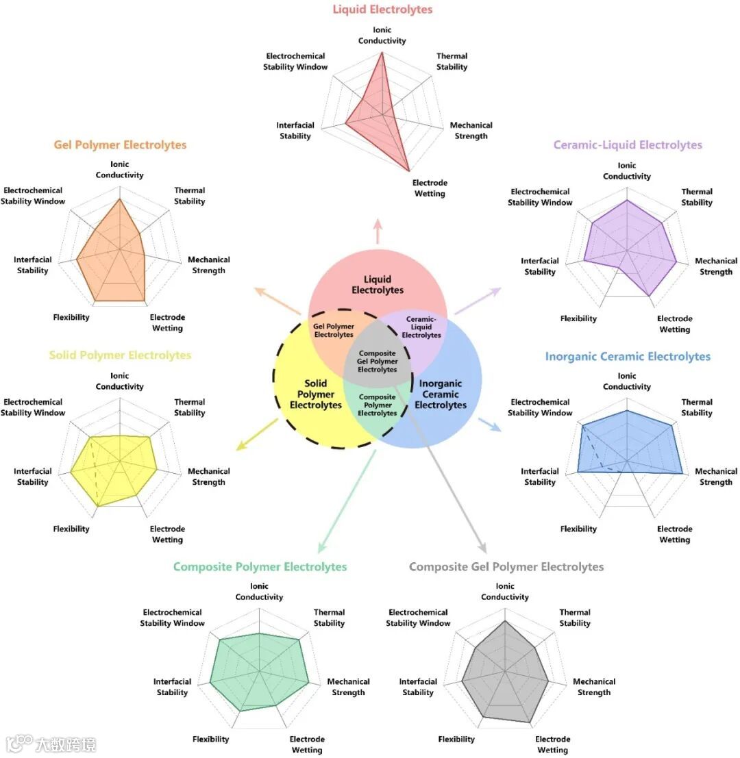 锂电池电解质大体可分为液态电解液和固态电解质两大类,其中固态电解质包括有机聚合物电解质和无机陶瓷电解质。它们有各自显著的优缺点。为了进一步提高电解质的综合性能,常常将它们组合,而形成复合电解质。其中,聚合物基固态电解质(虚线标注)拥有最综合的各项性质,最适于高比能固态电池的构建。