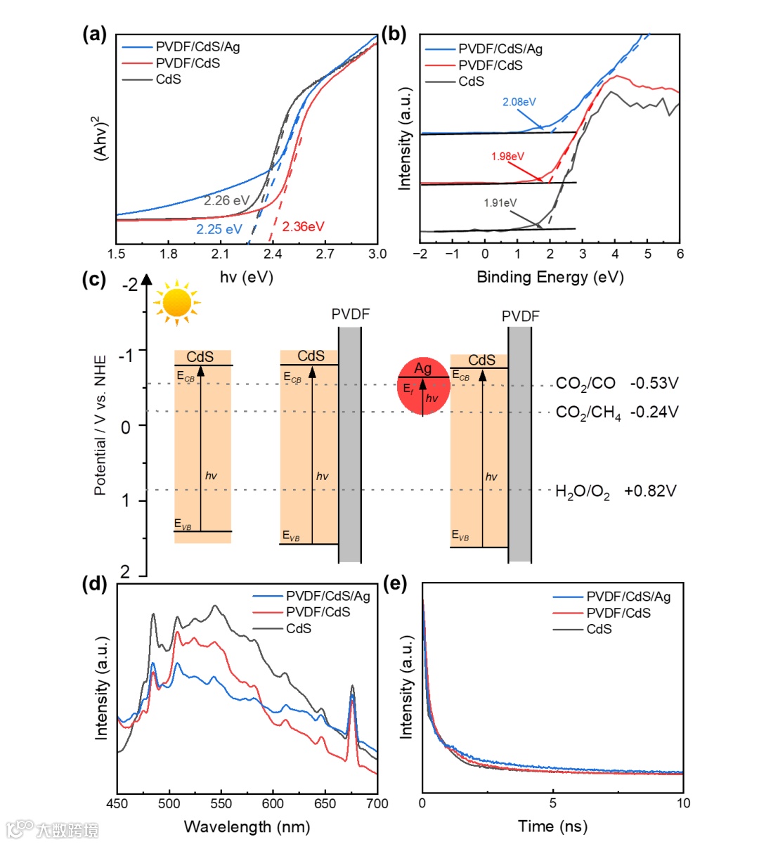 PVDF 自发极化电场可作为内建电场,实现光生载流子的高效分离。Ag的LSPR和PVDF的内建电场被充分利用来提高光催化剂的活性。与 CdS 粉末相比,CdS/Ag 和 PVDF/CdS 的CO2 的光催化还原效率分别提高了3倍和6倍,PVDF/CdS/Ag 的光催化还原效率提高了23倍,表明 LSPR 和内建电场具有显著的协同效应。