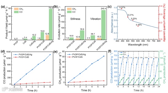 PVDF/CdS/Ag纤维膜在微振动下具有不断重建内建电场的特性。同时,压电效应和 Ag 纳米粒子的LSPR效应也表现出明显的协同效应。在微振动的条件下,PVDF/CdS/Ag的CO产率是静态条件下的三倍,达到 240.4 μmol·g-1·h-1。CdS 和 PVDF 的压电效应使催化剂在微振动(如气流驱动)下就能表现出很高的光催化性能,这与其他由超声波驱动压电效应相关的光催化剂相比,具有更优越的实际应用性。