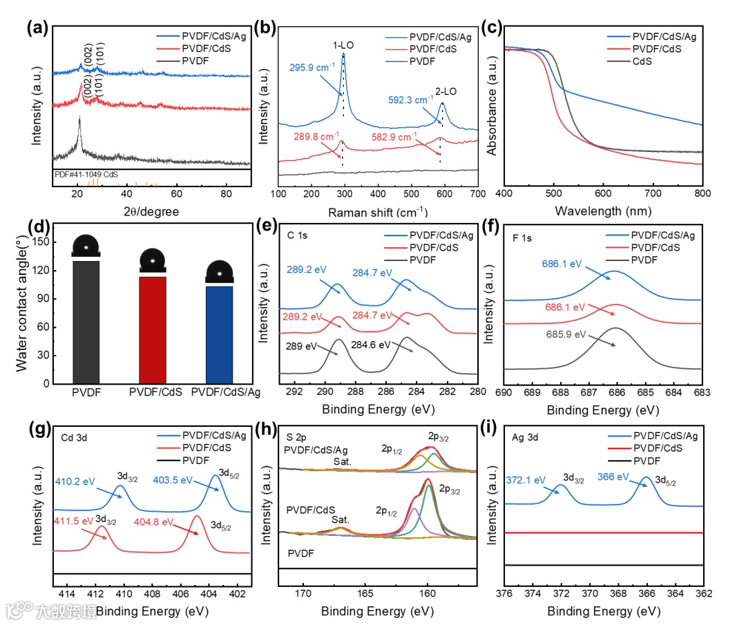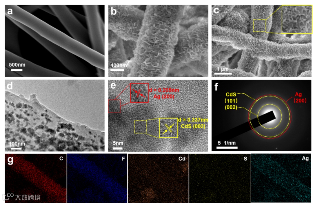 通过电纺丝技术制备了具有高压电性能和高比表面积的 PVDF 纤维膜,并首次通过 Cd2+和F- 配位将纳米片状的CdS原位组装在 PVDF 纤维表面。之后在 CdS 表面上沉积了纳米银颗粒,形成了具有宽波长的光催化剂。