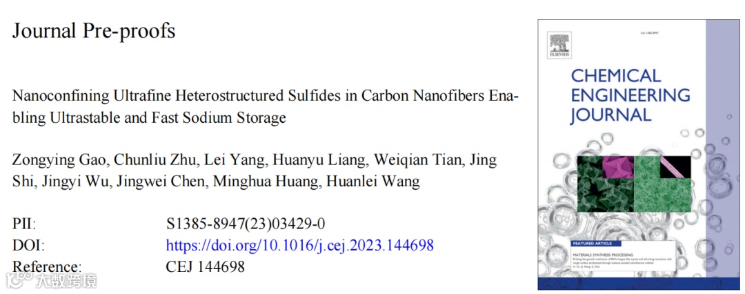 近日,中国海洋大学王焕磊教授和田维乾副教授在国际知名期刊Chemical Engineering Journal上发表题为“Nanoconfining Ultrafine Heterostructured Sulfides in Carbon Nanofibers Enabling Ultrastable and Fast Sodium Storage”的研究论文。该论文分析了通过独特的纳米限域策略和静电纺丝技术制备的碳纳米纤维耦合超小型异质金属硫化物在钠离子电池中的优异表现。其中,文中提供了构筑超小型纳米颗粒的新思路。