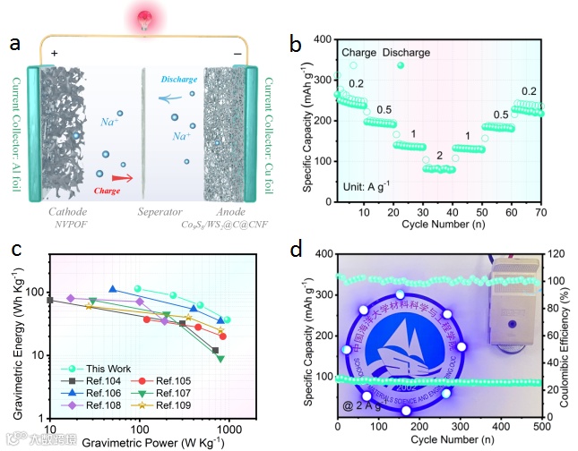 基于Co9S8/WS2@C@CNF在钠离子半电池中的优异表现,进一步组装了Co9S8/WS2@C@CNF//NVPOF全电池,其展现了113 Wh kg-1的高能量密度和950 W kg-1的功率密度,证明了该负极材料具有一定的实际应用价值。
