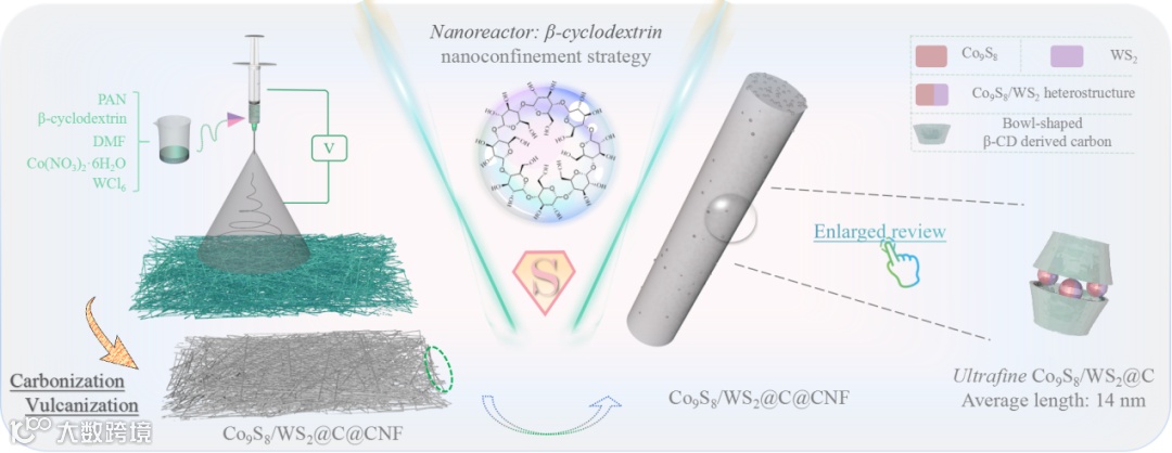 传统的过渡金属硫化物负极材料(TMS)在电化学反应过程中面临着严重的多硫化物的穿梭效应、活性物质的堆积聚集以及巨大的体积应变,从而导致TMS基负极在SIBs体系中具有较差的电化学稳定性。本文中利用具有“碗状”结构的β-环糊精(β-CD)的纳米限域策略以及静电纺丝技术实现了超小型异质Co9S8/WS2@C纳米颗粒在碳纳米纤维内的负载。纳米颗粒的超细化、碳纳米纤维的包覆以及异质结构的构建,优化了电极材料在SIBs中的电化学特性。