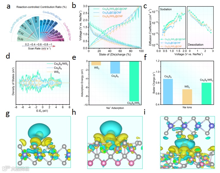 以不同扫速进行CV测试继而计算相应的反应控制占比,并进一步通过GITT测试计算扩散系数,数据结果表明Co9S8/WS2@C@CNF具有较大的反应控制占比以及较高的扩散系数,这反映了Co9S8/WS2@C@CNF具有优异的电化学动力性能。其中,Co9S8-WS2异质结构的构筑是动力学性能的提升关键因素。我们进一步应用DFT理论计算,通过测定WS2、Co9S8和Co9S8/WS2界面的电子态和Na的吸附能,进一步验证了异质结构在电化学过程中的重要作用。