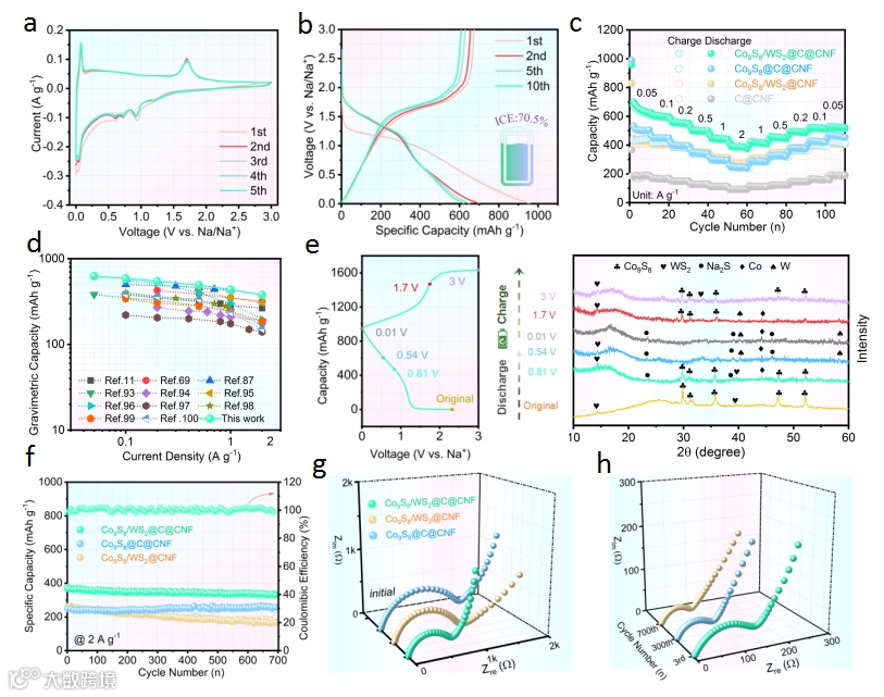 图4. Co9S8/WS2@C@CNF、Co9S8@C@CNF和Co9S8/WS2@CNF电极的电化学性能。