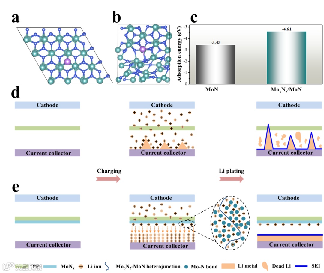 图7 预测构型、吸收能比较及机理说明。(a) Li-MoN;(b) Li-MoNx异质结界面;(c) 吸附能比较;(d) PP和(e)功能化MoNx/PP隔膜在LMBs中对锂离子调节和负极保护的机理示意图。