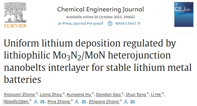 基于此,近日,来自陆军军医大学的张平和张治钢老师与电子科技大学的陈远富教授合作,在国际知名期刊Chemical Engineering Journal上发表题为“Uniform lithium deposition regulated by lithiophilic Mo3N2/MoN heterojunction nanobelts interlayer for stable lithium metal batteries”的观点文章。该观点文章报道了一种亲锂的Mo3N2/MoN(MoNx)异质结纳米带作为锂金属电池(LMBs)的多功能隔膜改性材料。一方面,MoNx异质结纳米带具有高的机械强度,可以提供足够的刚性来抑制锂枝晶的生长,另一方面,异质结界面和丰富的Mo-N极性键的共存提供了足够的锂沉积活性位点,促进并引导了锂离子的重新分布,从而实现了均匀、致密和平滑的锂沉积;此外,MoNx异质结纳米带功能化隔膜具有良好的电解液润湿和接触性能、较高的锂离子电导率和锂离子迁移数以及较强的热稳定性,促进了锂离子的传输和迁移动力学行为;因此,由MoNx改性隔膜组装的锂金属电池的库伦效率、活性物质利用率、比容量以及循环稳定性均得到了提高,表明MoNx功能化的隔膜在高安全性、无枝晶锂金属电池中具有较大的应用潜力。本文提出的过渡金属氮化物基异质结材料及构筑方法为稳定锂金属负极和抑制锂枝晶生长提供了新思路。