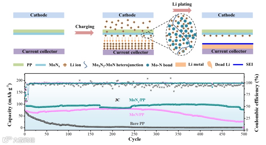 图1 MoNx异质结纳米带界面层调控锂离子实现均匀沉积的机理图及全电池长循环图。
