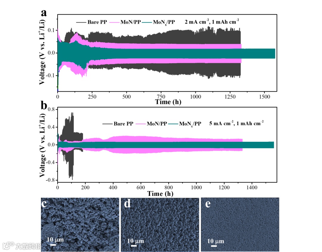 图5 PP,MoN/PP和MoNx/PP隔膜封装的Li//Li对称电池在不同测试条件下的循环稳定性能。(a) 2 mA cm-2,1 mAh cm-2;(b) 5 mA cm-2,1 mAh cm-2;在2 mA cm-2,1 mAh cm-2循环100圈后锂负极表面的SEM图 (c) PP;(d) MoN/PP;(e) MoNx/PP。