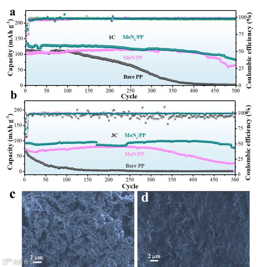 图6 PP,MoN/PP和MoNx/PP隔膜封装的Li//LFP全电池在不同测试条件下的电化学性能。(a) 1C;(b) 3C;在1C下循环100圈后锂负极表面的SEM图 (c) PP;(d) MoNx/PP。