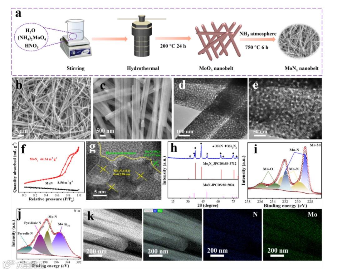 图2 MoNx功能材料的制备于表征。(a) MoNx的制备示意图;(b, c) SEM图, (d, e) TEM 和 (g) HR-TEM图;(f) MoNx 和商业 MoN的氮吸附图;(h) MoNx的XRD图;XPS谱图Mo 3d (i) 和 N 1s (j);MoNx中N和Mo的元素分布图 (k)。