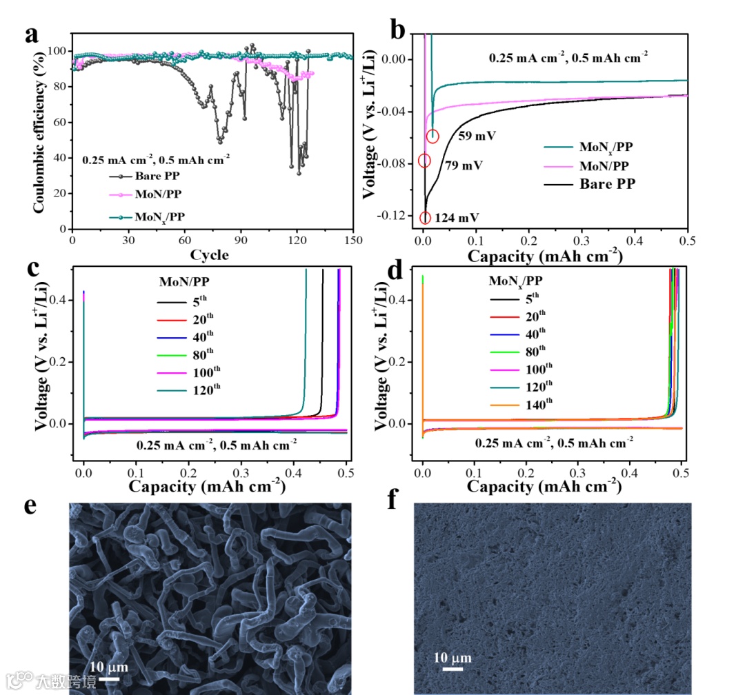 图4 不同隔膜封装的Li//Cu非对称电池在沉积容量为0.5 mAh cm-2,电流密度为0.25 mA cm-2下的电化学性能。(a) PP,MoN/PP和MoNx/PP隔膜电池的库伦效率;(b) PP,MoN/PP和MoNx/PP隔膜电池第一圈循环的过电位;(c) MoN/PP和(d) MoNx/PP封装的Li//Cu电池Li沉积/剥离电压曲线;(e) PP和(f) MoNx/PP封装的Li//Cu电池循环失败后的电池拆开后沉积在Cu表面的Li形貌。