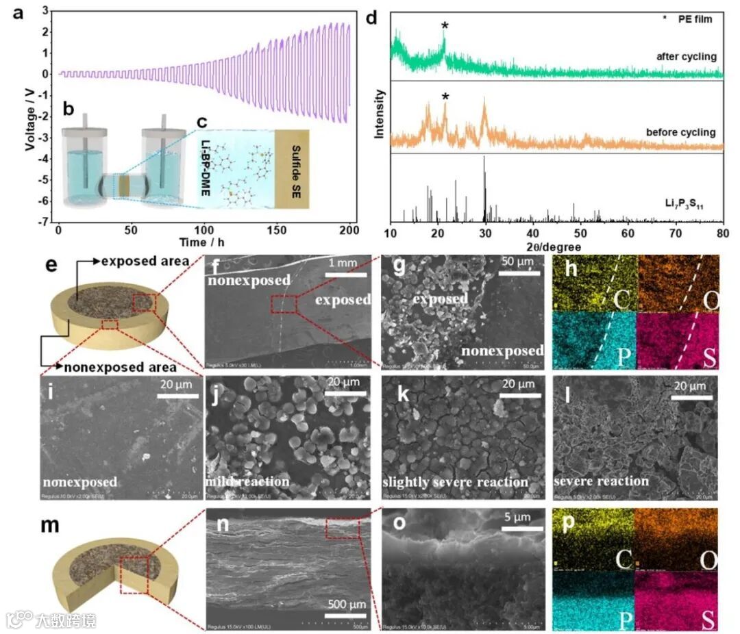 这种界面层不能发挥兼容作用,因此不适合硫化物SE和液体电解质电池系统。PEO-LiTFSI聚合物具有良好的化学/电化学稳定性,可以作为硫化物SE和金属锂之间的界面层,起到良好的界面保护作用。因此,尝试将PEO-LiTFSI聚合物引入硫化物SE和液态金属负极体系中,具体制备过程见图4c。图4i所示为制备好的带有PEO界面层的Li7P3S11薄片,它被组装成一个对称电池。电压曲线如图4j所示。该对称电池在电流密度为0.127 mA cm-2的情况下稳定循环200h,极化电压0.115V几乎没有变化,表明PEO-LiTFSI聚合物和Li-BP-DME之间反应形成的SEI与硫化物SE Li7P3S11兼容。