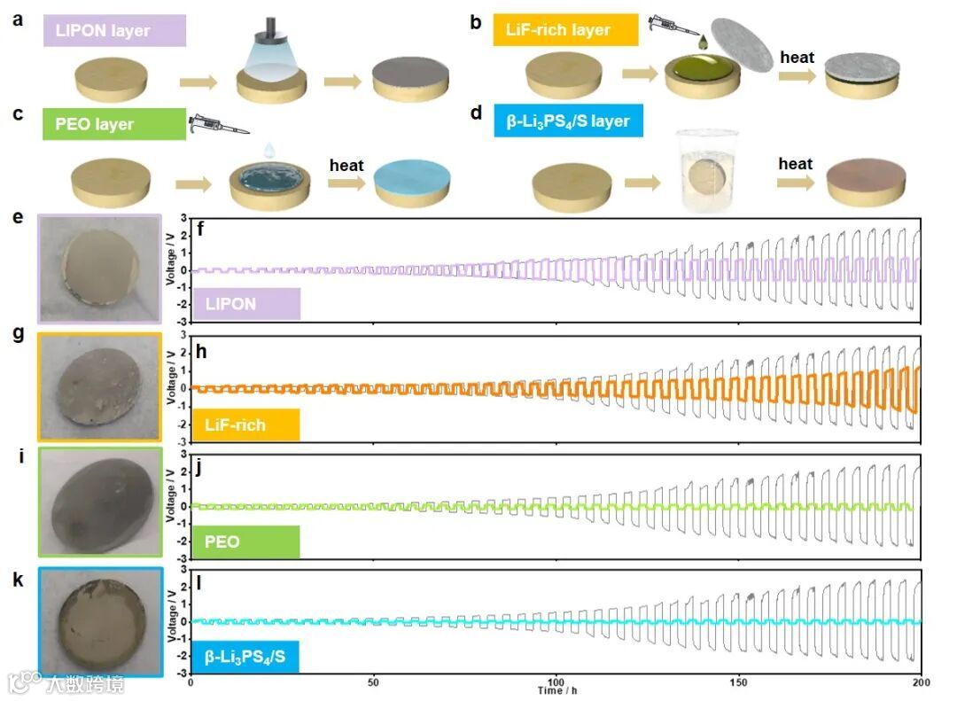 根据上述特征分析,由硫化物SE和有机LE Li-BP-DME反应形成的SEI不能稳定地兼容。因此,有必要设计出化学/电化学稳定、高锂导电性和电子绝缘性并与有机LE Li-BP-DME和硫化物SE兼容的人工SEI层。此文选择了四种可能适用于硫化物SE和液体有机阳极的界面层材料,包括LIPON、富含LiF的界面层、PEO-LiTFSI聚合物和β-Li3PS4/S(如图4a-4d所示)。LIPON界面层的厚度为200纳米,通过磁控溅射在硫化物SE片上,如图4e所示。图4f显示了在固定电流为0.127 mA cm-2时,由Li7P3S11、Li-BP-DME和LIPON界面层组装的对称电池的电压曲线。对称电池显示出低的初始过电位(0.08V),但在循环200小时后电压迅速上升到0.68V。低的初始过电位表明在循环前有一个小的界面阻抗和良好的界面接触,但迅速增加的电压表明LIPON和Li-BP-DME之间有严重的反应。因此,LIPON界面层并没有起到稳定界面的作用。