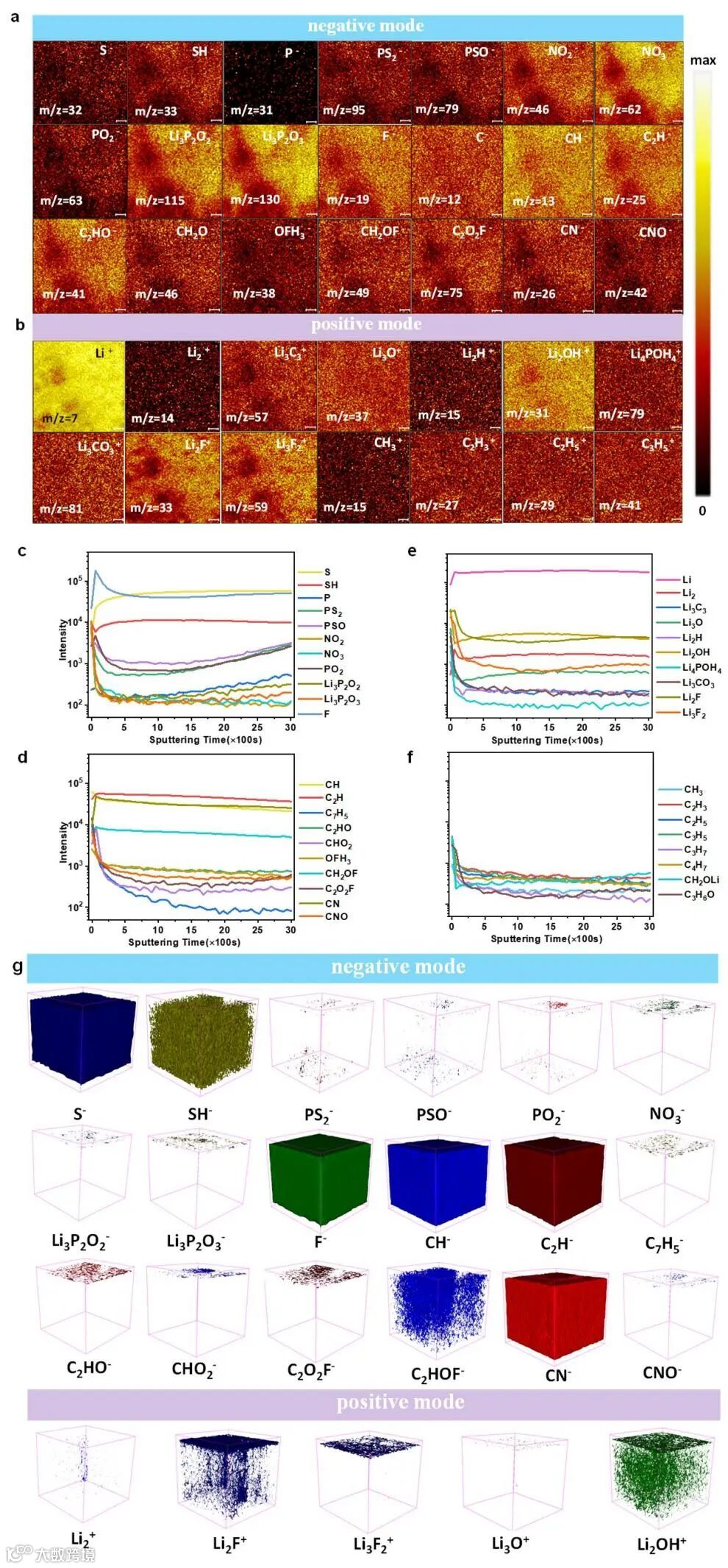 根据负离子和正离子模式的深度曲线(图7c-7f),S-、SH-和Li+二次离子碎片的信号强度随着深度的增加而增强,这表明SEI层中越来越多的Li2S(S-)、LiSH(SH-)无机物。一些无机离子碎片(如F-、PSO-、PS2-、PO2-、P-、Li3P2O2-、Li2+、Li2OH+、Li2F+、Li3F2+和Li3O+)的信号强度随着深度的增加先减后增,说明这些无机物在SEI表面或深层的分布较多,而在SEI表层的分布较少。其中,无机物LiF(F-、Li2F+、Li3F2+)、LiOH(Li2OH+)、Li3PO4(Li3P2O2-)、Li2O(Li3O+)都是有利于Li+传导的成分。其他无机二次离子碎片如NO2-、NO3-、Li3CO3+、Li2H+、Li3C3+和Li4POH4+的信号强度随着深度的增加而降低,说明Li2NO3(NO2-、NO3-)、Li2CO3(Li3CO3+)、LiH(Li2H+)、LiC(Li3C3+)等无机物更多地分布在SEI层的表面,在SEI层内部分布很少。CN-、CH2OF-、CH-和C2H-的信号强度很强,但随着深度的增加而降低,表明这些有机物主要分布在靠近SEI的表面。CN-的存在表明小的乙腈分子仍然存在,而CH2OF-是LiTFSI的分解产物。其他有机离子碎片,C7H5-, C2HO-, CHO2-, OFH3-, C2O2F-, CNO-, CH3+, C2H3+, C2H5+, C3H5+, C3H7+, C4H7+, C3H6O+, CH2OLi+的信号强度随深度增加而明显下降,说明这些有机物只分布在SEI的表面。这些离子碎片的信号强度随深度变化的信息在三维分布图中得到了更直观的体现(图7g)。