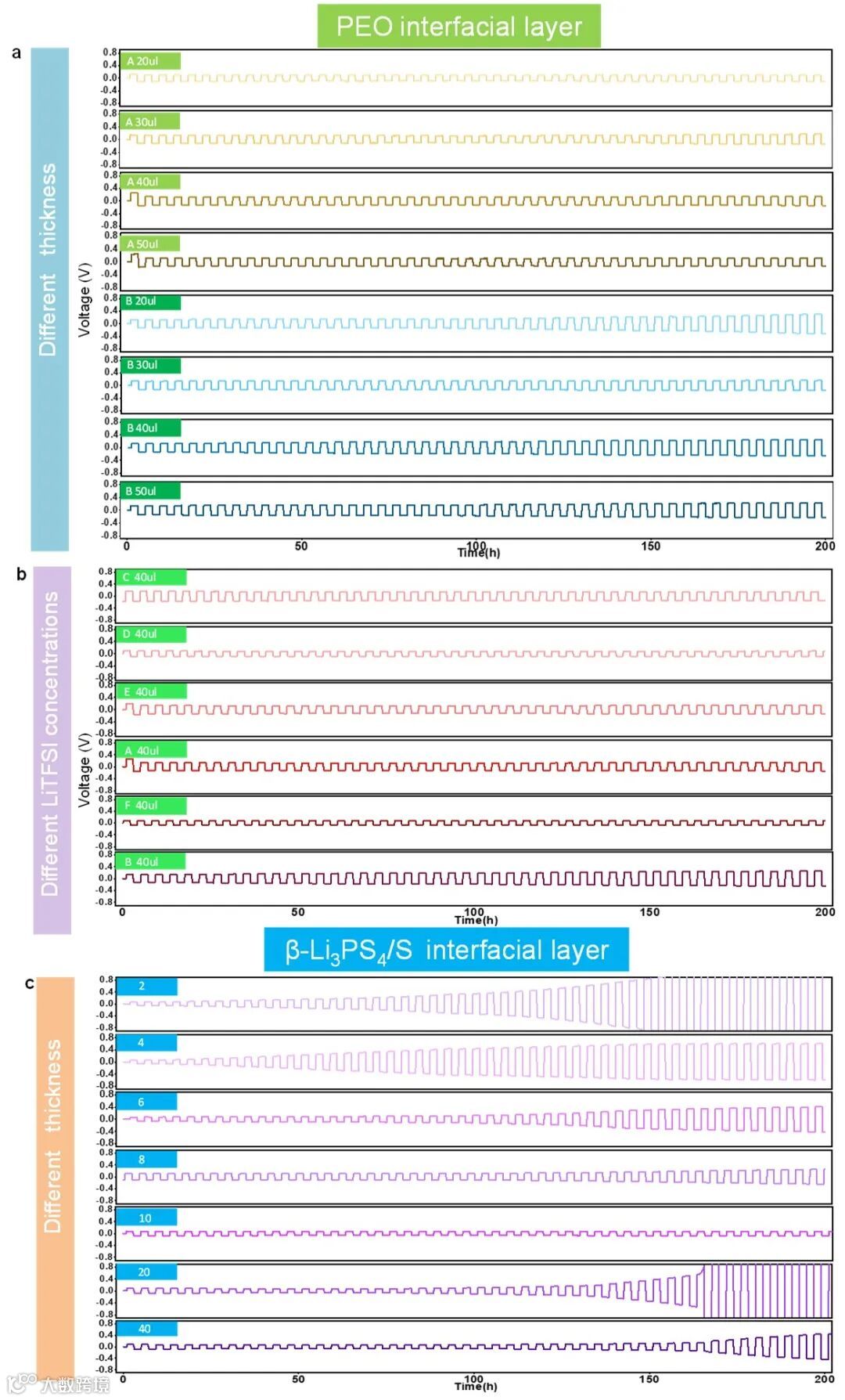 结果表明,在两种锂盐浓度下,不同量的PEO溶液(或不同厚度)的PEO界面层,对称电池在稳定循环200h后,在0.127mA cm-2的电流密度和0.15V左右的小极化电压下表现出良好的循环性能。接下来,我们探讨了不同浓度的锂盐LiTFSI的界面层在相同厚度下的有效性(图5b)。在固定的PEO溶液体积(40μL)下,研究了不同锂盐浓度EO/Li+=120、62.5、30、24、12和8的界面层并组装成对称电池。结果表明,在电流密度为0.127 mA cm-2、极化电压为0.15V左右的小电流下,具有不同锂盐LiTFSI浓度的界面层的对称电池也显示出良好的循环稳定性(200小时)。对PEO界面层的两个最佳参数的探索实验表明,PEO-LiTFSI系统的界面层在实验探索的广泛参数范围内具有良好的有效性。依次探讨了β-Li3PS4/S界面层的最佳厚度参数(图5c)。β-Li3PS4/S界面层的厚度是通过控制硫化物SE Li7P3S11片在β-Li3PS4/S前驱体溶液中的提拉次数来调节的。提拉次数分别为2、4、6、8、10、20和40。