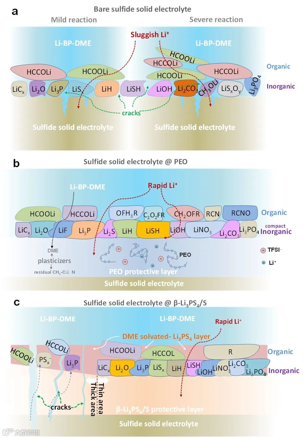 经过一系列的表征分析,得到了裸Li7P3S11以及PEO-LiTFSI和β-Li3PS4/S界面保护层的SEI信息,如图9a-9c所示。裸硫化物SE Li7P3S11的SEI结构(图9a)由两层组成。靠近有机LE Li-BP-DME的一侧是一个松散多孔的有机层,它是由Li-BP-DME的联苯和二甲醚分解形成的。这种可被液态金属锂渗透的SEI层包括一个相对密集的无机内层和一个富含有机物的外层。在Li7P3S11的一侧是一个无机松散层,其中分布着少量的有机物。因此,Li-BP-DME溶液可以穿透这层非致密的SEI,继续与硫化物SE反应,导致这个电池系统的失败。还得到了一个清晰的PEO-LiTFSI界面保护层的SEI结构(图9b)。这个SEI层由PEO框架组成,它与Li-BP-DME的化学性质稳定,其中存在大量的无机Li+导电成分(LiF, Li2CO3, Li2NO3, Li3P, Li2S, LiH, LiCx, Li2O, Li3PO4, Li2SO3, LiSH, LiOH)。这些无机成分相互合作,以提高Li+的导电性和阳极一侧的电子绝缘性。再加上少量的乙腈小分子和甲氟烷(CH2OF-)的作用,SEI层在室温下可以有效地传导Li+。图9c显示了β- Li3PS4/S界面保护层的SEI结构,它由两层组成,靠近Li-BP-DME的一层是溶解的β- Li3PS4/S。另一层是靠近硫化物SE Li7P3S11的密集的β- Li3PS4/S层。同时,一些无机锂导体Li2CO3、Li3PO4、LiF、Li2O、Li3P、LiSx、LiOH(Li2OH+)和LiSH相互配合,提高了Li+的导电性和阳极一侧的电子绝缘性。