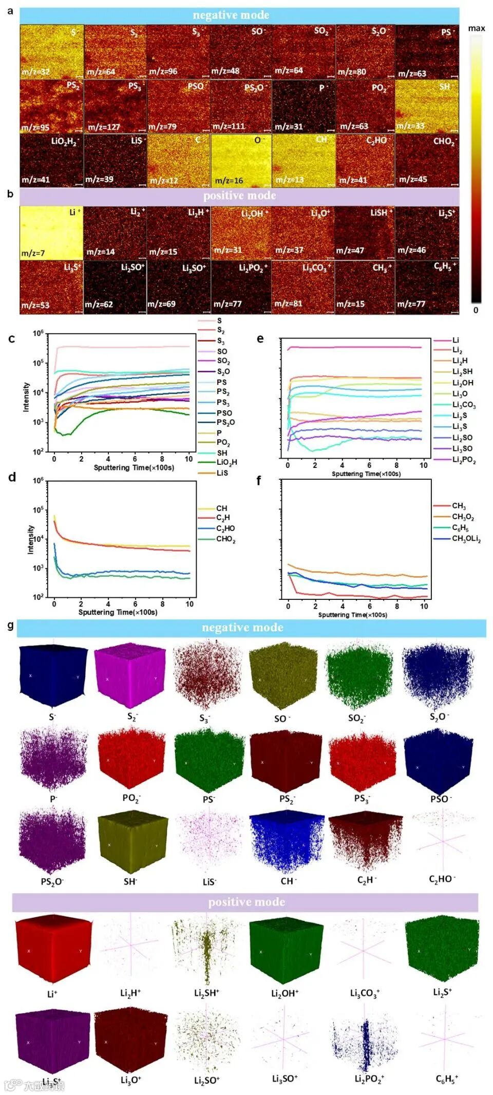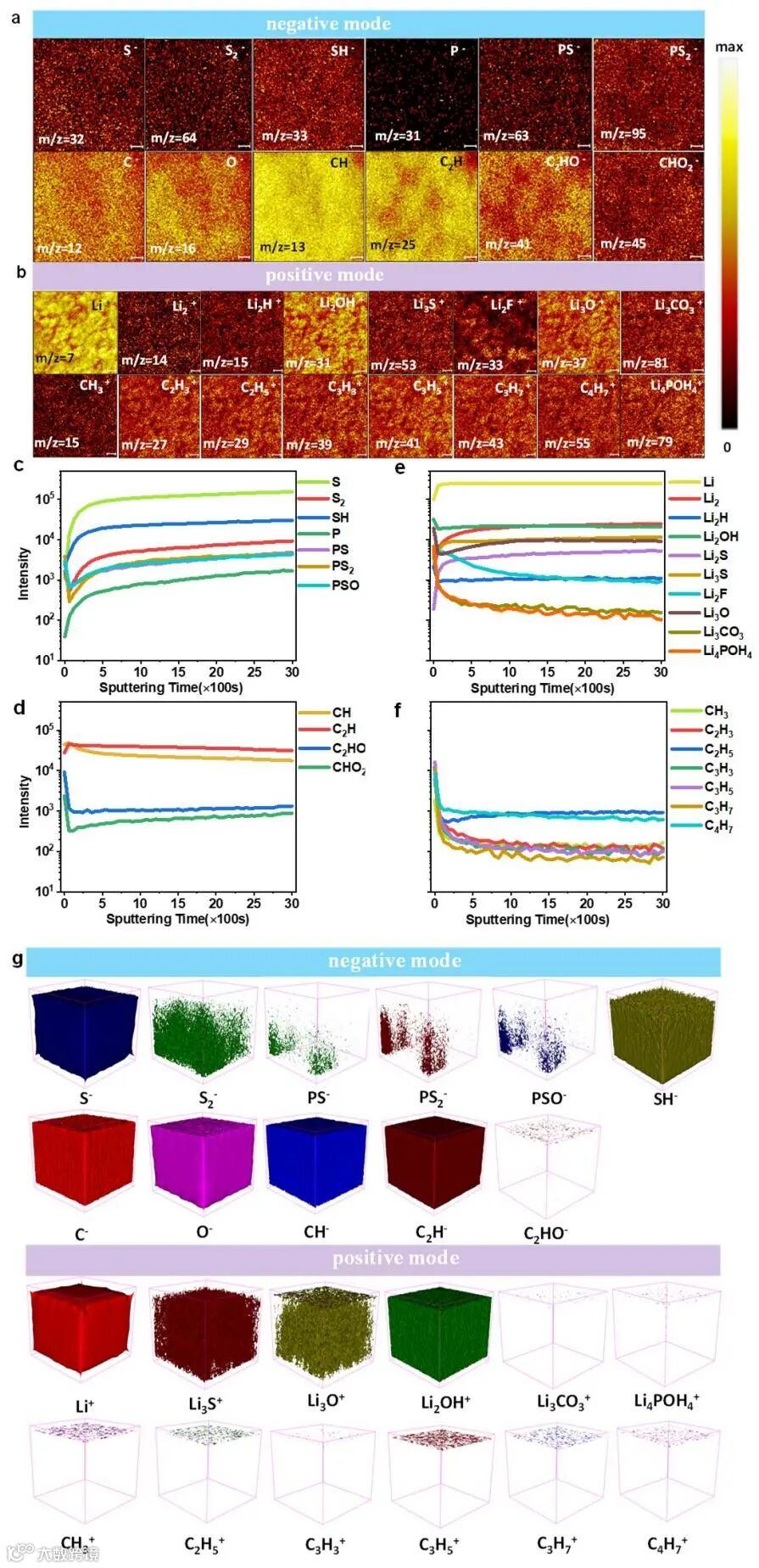 根据负离子和正离子模式的深度曲线(图8c-8f),Li2H+、Li3CO3+、Li4POH4+和Li2F+(杂质碎片离子)的信号强度随深度增加而降低,说明SEI层表面存在Li2H(Li2H+)、Li2CO3(Li3CO3+)、Li3PO4(Li4POH4+)和LiF(Li2F+)。其他无机离子片段,如S-、S2-、SH-、P-、PS-、PS2-、PSO-、Li2+、Li2S+、Li3S+、Li3O+和Li2OH+的信号强度随着深度的增加而增加,表明Li2O(Li3O+)、Li3P(P-)、LiSx(Li2S+, Li3S+)、 LiOH(Li2OH+)、LiSH(SH-)和与Li7P3S11有关的离子性物种PSx-(P-、PS-、PS2-、PSO-是PSx-的氧化产物)在SEI层的分布相对较多,在SEI表层的分布较少。与无机物的信号强度相比,大多数有机物(CHO2-, C2HO-, CH3+, C2H3+, C2H5+, C3H3+, C3H5+, C3H7+, C4H7+)的信号强度较弱,并随着深度的增加而降低,说明它们只分布在SEI表面。相反,CH-和C2H-信号强度较强,并随深度的增加而减少,表明SEI中的有机物质。这些二级离子片段的信号强度随深度变化的信息在三维分布图中得到了更直观的体现(图8g)。