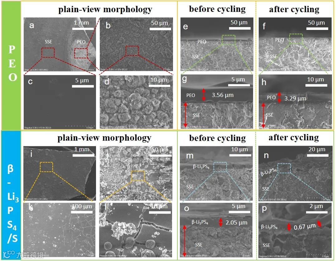 循环后的PEO和β-Li3PS4/S界面层的特征由SEM描述,如图6所示。图6a-6h显示了循环后PEO界面层的SEM图像,其中图6a-6d显示了平视形态,图6e-6h显示了横断面形态。图6a显示了循环后带有PEO界面层的Li7P3S11板材。片材的中间部分与Li-BP-DME接触以产生SEI,而片材的边缘部分是涂在Li7P3S11片材上的原始PEO薄膜,没有与Li-BP-DME接触。PEO界面层与Li-BP-DME反应的部分的形态与Li7P3S11片材的未反应区域明显不同。图6c显示了未反应区域的PEO层的放大SEM图像,它是光滑、平坦和致密的。图6b和6d显示了SEI区域的放大SEM图像,它也是致密的,而不是裸Li7P3S11片材的充满裂纹的片材(图1k和1l)。SEI表面是凹凸不平的鱼鳞层,说明靠近Li-BP-DME的SEI表面是以有机物为主体。图6e-6h显示了PEO界面层的横截面形态。循环前的SEM图像为图6e和6g,显示了3.56μm的PEO界面层的致密和平整。图6f和6h显示了循环后PEO界面的SEM图像,其厚度为3.29μm,与循环前相比,其厚度略有减少。然而,它仍然是致密和相对平坦的,没有裂缝。在PEO界面层下的Li7P3S11薄片也得到了很好的保护和致密,没有出现裸Li7P3S11的分层(图1n)。从这两个角度来看,PEO界面层可以有效地阻止液态金属锂-BP-DME对硫化物SE Li7P3S11的侵蚀。