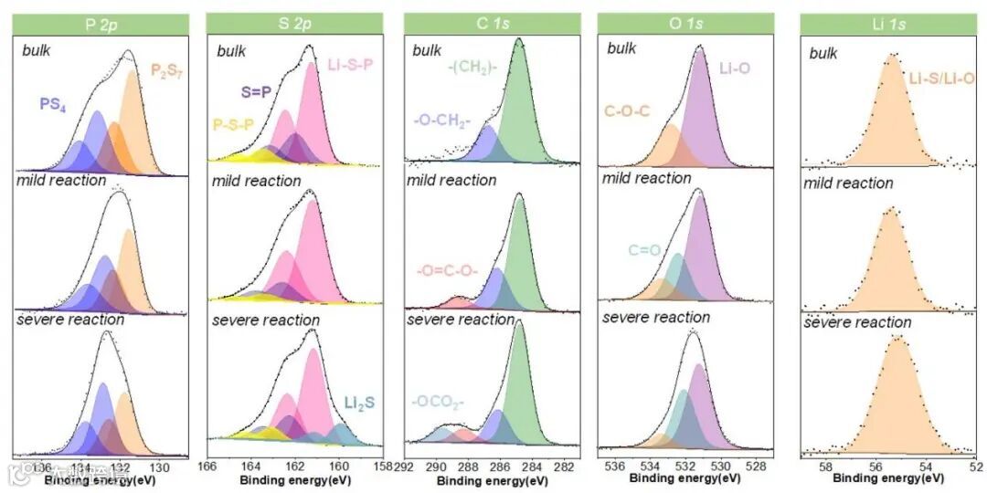 在块状Li7P3S11中,S 2p信号可由三种不同的硫物种描述,在161.3、162.0和163.4 eV处发现峰值,它们分别对应于P-S-Li、P=S和P-S-P硫物种。峰区产生的P-S-Li、P=S和P-S-P硫磺物种的比例约为7:3:1,与Li7P3S11结构模型的理论值非常吻合。在Li7P3S11的轻度和重度反应区,属于P2S7相的P-S-P的峰面积比下降,这也证实了P2S7相的溶解。此外,在严重反应区,159.9 eV的新峰被赋予Li2S,这源于Li7P3S11 SE与液体金属锂的反应。