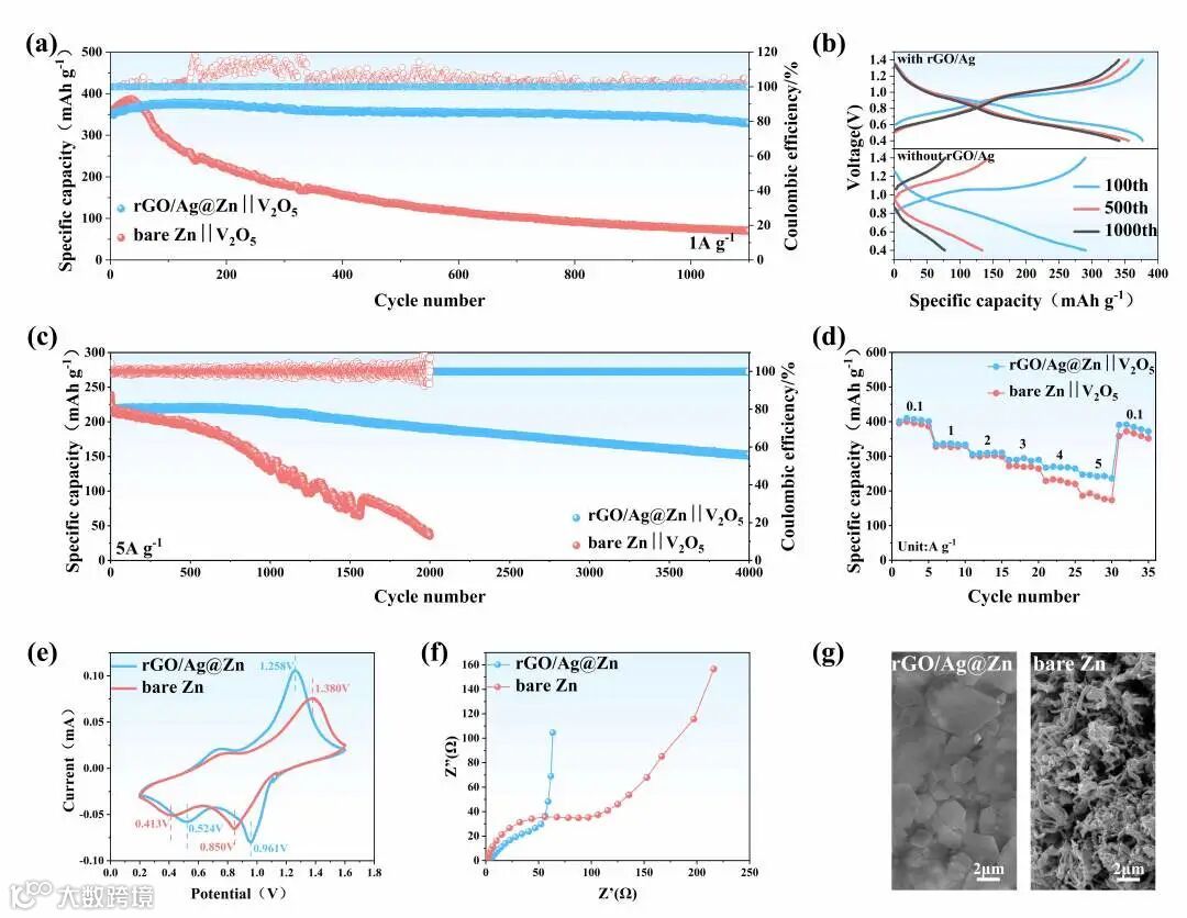 使用商用V2O5正极组装全电池进行恒流充放电长循环测试,验证了该电池的实际应用。如图所示,rGO/Ag@Zn||V2O5全电池在1A g-1的电流密度下能够达到350.8 mAh g-1的超高初始放电比容量,在随后的循环中也能保持和稳定,而Zn||V2O5全电池即使也在初始的时候展现出了352.4 mAh g-1的高放电比容量,但在随后的循环中迅速下降,并且库伦效率也是出现了大幅度的波动现象,说明电池内部发生了微短路。进一步将相对较高的电流密度(5 a g-1)施加到全电池上, rGO/Ag@Zn||V2O5全电池在4000次循环后仍能保持有更高的放电比容量,达到157.5 mAh g-1,且容量保留率约为70%左右,而Zn||V2O5全电池仅在1500次循环时容量便出现急速衰减且库伦效率也出现大范围的波动,可能是在大电流下负极枝晶生长严重,刺穿了玻璃纤维隔膜造成短路。最后,对循环后的全电池进行拆卸,并在扫描电镜下观察负极的形貌。不出意外,rGO/Ag@Zn负极依然保持光滑致密的“平躺”式六方锌片沉积,而在裸锌负极上就出现了大量凌乱的锌枝晶并且在枝晶之间掺杂有蛮多的玻璃纤维,说明枝晶已经刺穿到隔膜里面,并在其间继续成核生长,是造成随后电池短路和容量衰减的主要原因。